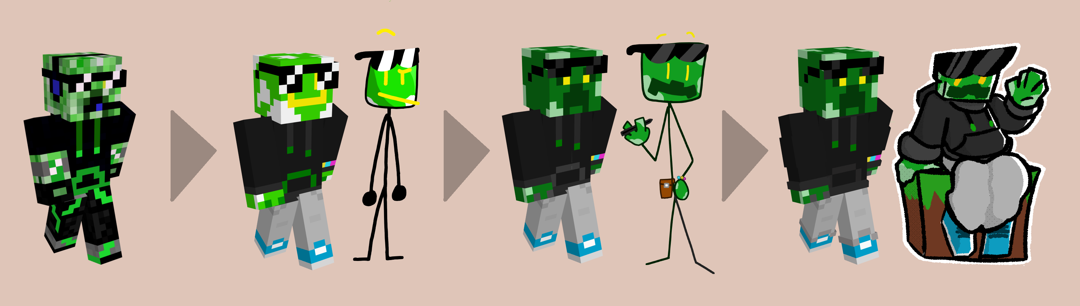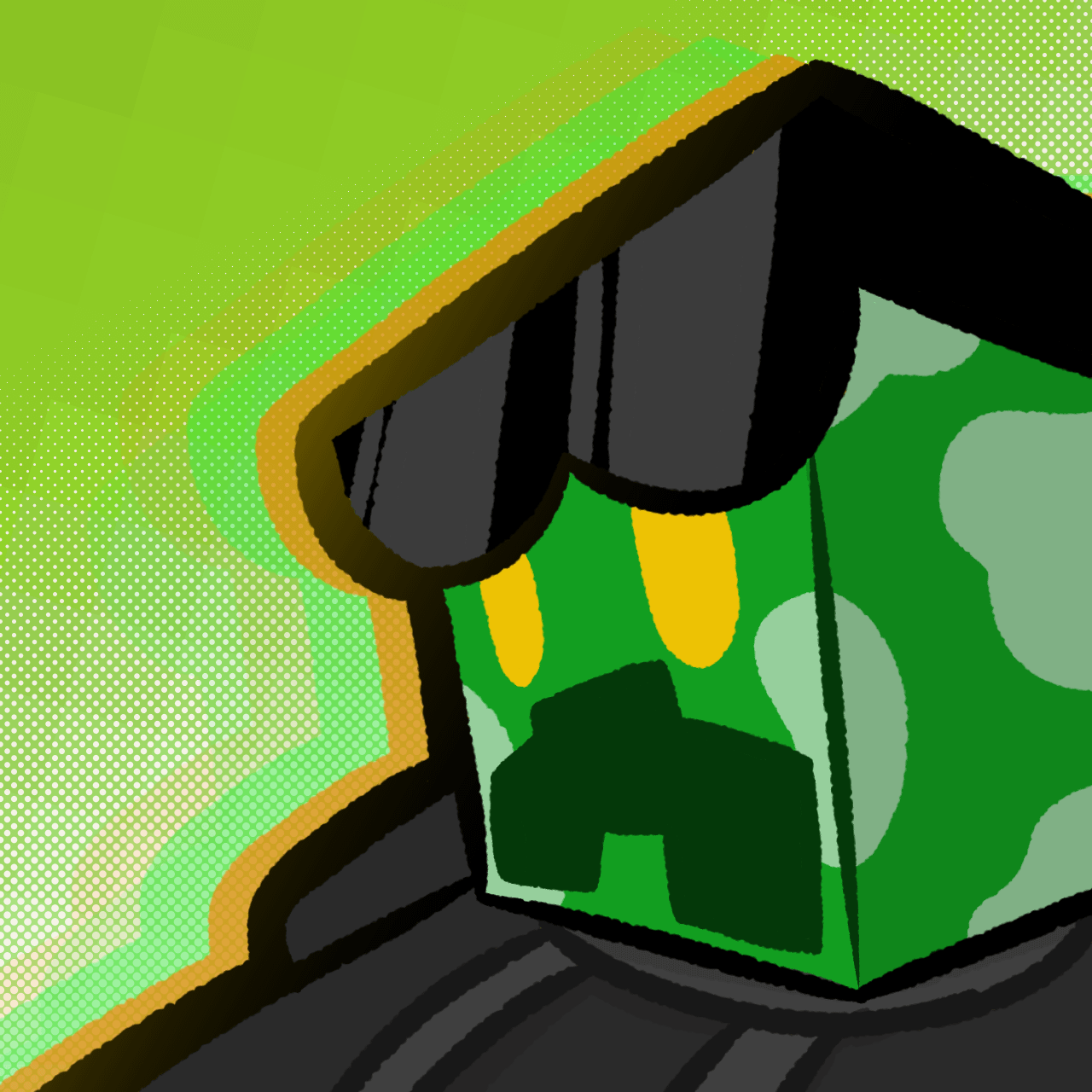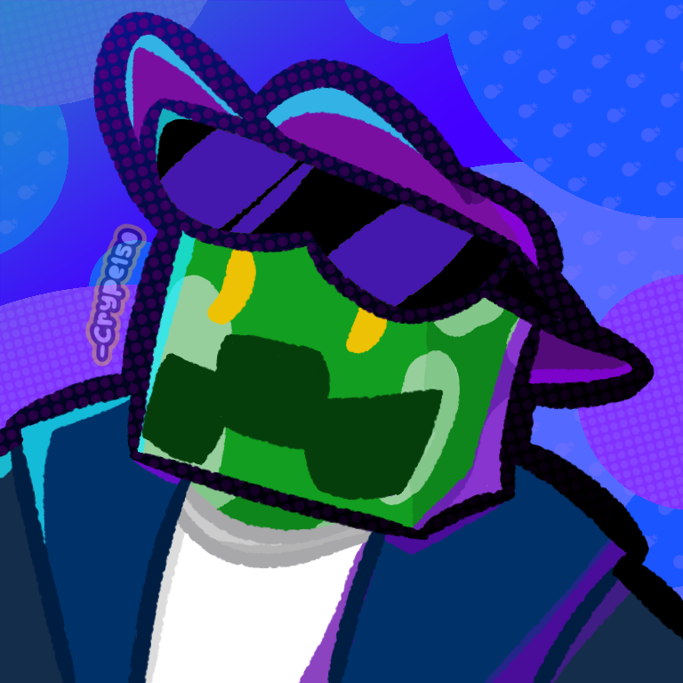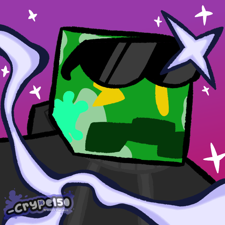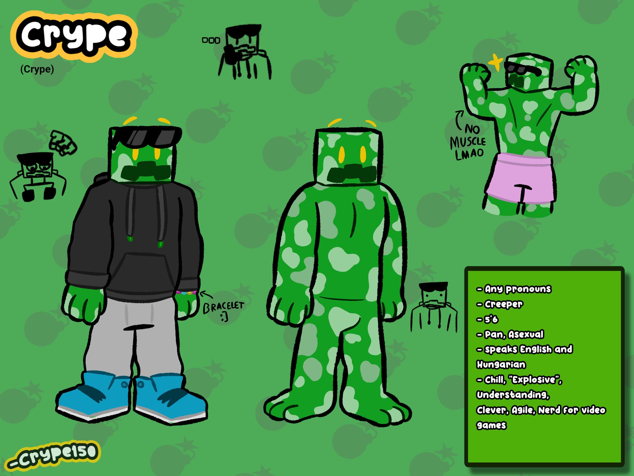 Crype (or Crype150) is the main mascot of my online presence who I represent myself with the most publicly. The character represents an anthropomorphic Creeper with glowing yellow eyes. They do not represent themselves with a sexuality or gender and they go by any pronouns. Crype has different versions depending on what universe I feature them in, information about those versions will be available on here in the future.